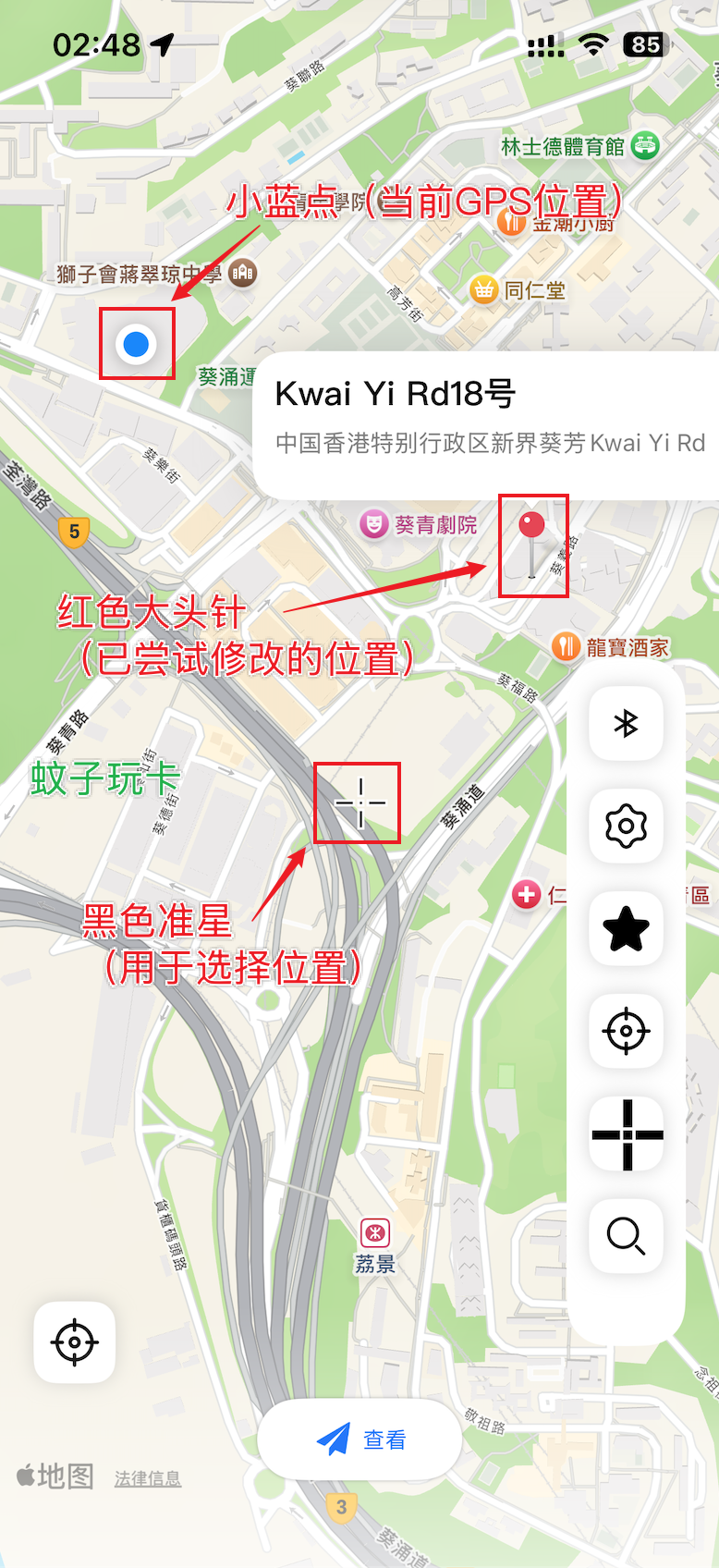 如果要修改的位置距离较近(<10 KM),你可以直接拖动地图,将黑色准星对准目标位置,然后点击底部的“查看”按钮即可完成位置更改。